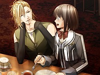 He finally agrees and then the two of them go to see Master and she requests he implant a weapon into her. This time he implants a bow/arrow type weapon and during the procedure Cain holds her hand. 3 days pass and Cain trains with her to help her learn how to use her weapon properly. Eventually she does and they go to NEDE. Shiro and Reimei show up to fight evil shota while Cain and Futaba fight against Armor Eater and Abel. Thanks to Futaba’s weapon she kills Armor eater and Abel’s able to return to his senses before he passes out. In the epilogue they nurse Abel at the Fly Call residence and finally he wakes up. Cain is so happy he tells Futaba that he doesn’t “think” he’s falling for her, but at this point he’s so in love with her he can’t be without her and he kisses her in the garden. Overall I enjoyed the route but I never understood the deal with him changing from blonde gaijin to silver haired whip man. I mean he was only the blonde gaijin like maybe a quarter of the game? The rest of the game he stayed in his blue haired form and since his brother had the same color hair I don’t understand the whole blonde gaijin thing at all or what the point of it was. Also when he went back to his blue hair he stopped randomly throwing Engrish into his sentences and that just ruined all the fun xDD blah! Also in this route Reimei was like a psychopath locking Futaba in her room and following her to like even the bathroom @@;; Shiro was the only voice of reason, the darling. (*´ε`*)ミュミュ