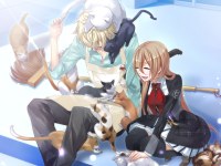 There are 3 endings for these two. First ending Izumi tries to save her from some dudes but instead ends up running away with her cause he’s a weak pansy. He asks her to come watch the stars with him and while he babbles about god knows what Tsukiko falls asleep on his shoulder. The poor sap almost craps his pants and then kisses her forehead and babbles about how embarrassed he is. Lol y so cute Izumi? ミュミュ(´ε`* )☆ He tells her that he will do his best to become an awesome hot man for her to fall in love with before she graduates. In end 2 it has Tsukiko spend some time with Haru talking about random crap and then they get attacked by a mob of nukos (who sound awful because Honeybee couldn’t afford to use cat sound effects or else I’m sure someone would bitch about plagiarizing 😆 ) In the 3rd end Tsukiko and Izumi use their lack of cooking skills to make some nasty curry for Haru’s going away party. He eats it anyway and cries a river that someone gave a crap about him. When he leaves he trolls Izumi and says that he will not give up on Tsukiko either. Tsukiko comments how those two went from childhood friends to rivals. Lol meh whatever. Izumi was cute but I couldn’t find myself giving a crap about Haru.