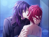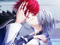 Knives – You know I am on the 3rd guy’s route here….is it THAT hard to ask for a good ending? I don’t mean an ending where there’s a kiss scene. I mean an ending where the fucking character I’m going after DOESN’T DIE. Is that so hard to ask Otomate? Sigh. So Knives is the super gentleman. Whenever even the shota attempts to do such as wash Noir’s back at the Farm, he rages and says that she is a woman and that cannot be allowed. He stays awake all night outside her room protecting her and making sure nobody comes. Once she wakes up is when he finally goes to sleep. What a guy ;_;. The only reason he became a criminal is because he once tried to protect a criminal girl because he didn’t want to see any women/children getting killed. Because of this he was labeled as a criminal and as more and more dudes went after him, he would kill them and his rank would just keep rising. Sigh. (´・ω・`) So then when that douche Sword shows up and threatens to kill Noir, Knives comes to save her but sadly the poor guy gets killed…in his own route. ( ಠ益ಠ ) As in the other routes, Zecs makes a cyborg out of Knives and he is sent to attack and kill Rain. Rain is confused but fights him and when Noir tries to intervene suddenly Knives has a memory strike and remembers her name. This gives Rain a chance to knock him unconscious and bring him back to the farm for consultation with Crimson.