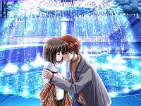 When that night Yuichi walks Ayu “home” she tells him that just the train station is enough. When they get there Ayu asks if Yuichi ever lost anyone important to him. She says that the thought of losing Akiko was like losing her mother again and she just couldn’t take it anymore. She says when she lost her mom she felt like a helpless child who couldn’t do anything. Yuichi suddenly remembers the feeling of losing someone as well and Ayu says that she can tell he has the same expression and he understands her pain. She tells him to close his eyes because her face is full of tears. He does so and she reaches up and kisses him. She lets go and apologizes saying she did it without thinking of his feelings but Yuichi says that he likes her and asks if she likes him too. Ayu says she’s liked him ever since back then and they make a promise to meet at the station the next day. They meet up the next day and hold hands as they walk around. That night Ayu comes through his house window saying she didn’t want to wake up anyone so she climbed up on the 2nd floor 😆 This is prolly where the ero scene was in the game but since we’re in PS2 land (and not Nayuki’s route) Yuichi acts like a gentleman and lets Ayu sleep in his room while he goes and sleeps downstairs on the couch. The next morning he meets her outside (she escaped before anyone could see her?) and says he wonders what kind of school Ayu goes to because she seems to love it so much. Ayu agrees to meet him in the evening and show him her school.