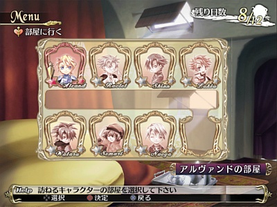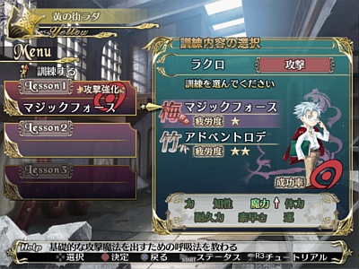 This is the main menu you get by pressing start I believe (sorry my gamepad is a rumble pad and I forgot what the 10 key is lol…) Anyway ステータス is the character status. Use this to refer to when you are training in towns and are not sure what stats to raise. アイテム are your items. I rarely ever use this menu as I didn’t bother using the gift giving feature in this game since training with your man of choice raises enough affection. 装備 is your equipment. As you travel through the towns and open up the yellow treasure boxes, you will get random equipment for your party members. You can equip it to see what the 3D sprites look like or just only equip it to the characters in your current party (typically Nina and 3 random dudes.) 入れ替え is if you want to change who is in your party for battles. At first you will only start out with a few guys so eventually you’ll want to change to your favorite. I started the game with Alvand and basically worked with him and eventually settled on Somari for healing and Naoya to just do backup damage for shits & giggles. Travel log is basically to save and option is just game options and the last one is return to title. RG is how much money you currently have. If you are broke at the start don’t worry about it. You really don’t HAVE to buy shop equipment but shop equipment IS better than what’s in the treasure chests. However I got by most of the game on treasure chest items and only when I was like flowing in money, I had a “summon shop” item in the dungeon and used it to buy some new gears for my active party members.