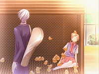 Lukia – Well Lukia’s our token shota but sadly he’s no Eric and so the route was kinda meh. I think Lukia’s character is cute and all but I guess I’m getting tired of the “Cute” Kishio voice and I want more Kishiero instead (ಠ_ಠ). I mean Lukia didn’t even get a kiss scene…how disappointing. I think the only good part of this route was the dream sequence where Lukia was her butler or waiter or something and that’s when he sounded hot. Otherwise he was this poor genki shota who was raised in a church by a priest named Noi and never had any friends his age. He has some writing on his arm but he has no idea what it means. Eventually things come to light when some dude (who I will coin as Pedobear) shows up and almost shotaraeps him fondling his arm with the writing on it. Lukia and Nina manage to run away and then they get to the church where Noin is. Lukia demands to know what the deal is with his arm and Noin tells him that he may be a rebirth of the only lady who had contact with the gods of Rode, Harumina. So basically we got Lukijesus running around while pedobear wants to corrupt him. So then pedobear comes back to the church demanding Lukia’s powers and Lukia’s like NOOO STOP! and so his powers go out of control and completely destroy the circumference around the church (but the inside is ok.) Next day Lukia wakes up and sees what he’s done and becomes a sad panda. When Naoya finds out that Nina likes Lukia, he’s like “damn I didn’t know you liked dem shotas (ಠ_ಠ)”. The route splits where Lukia asks Nina what she thinks about his situation. If you tell him that he’s a rebirth of Harumina you go to the “Other End”.