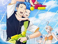 In the dream ending Nachi makes out with Manami in front of everyone and then gets all ichaicha with her in the student council office because while he & Kei graduated, she still does student council activities with Yousuke and Bomber. In the special story Kiyo is pulling stupid pranks on Kei and Nachi has to lug him away. In the Normal end Nachi thanks her for everything and decides to go to America to find the meaning of life or something. He then comes back to Japan and pulls a prank suitcase on her pretending that Kei was inside it…and the password to the lock was Manami’s 3 sizes アッヒャッヒャ!ヽ(゚∀゚)ノアッヒャッヒャ! Turns out while in America Nachi’s been learning the arts of annoying pranks from Kiyoharu WRYYYYYYY /(^o^)\ナンテコッタイ In Nachi’s append 1 he lives with Manami and rolls around in bed with her while apparently the A4 also moved into the same building and they harrass Kei & Chisato for breakfast every morning. Kei of course has to deal with it to make sure Nachi doesn’t get cockblocked because he cares so dearly about his otouto kun 😆 In the append end 2, apparently Nachi intends to be a defense lawyer while Kei wants to be a righteous policeman so the 2 of them argue about some kind of ongoing case while at the same time then arguing about the tea they are drinking プッ(※థэథ)∵.*.∵ This was also before Kei cockblocked on Nachi about to stick his hand up Manami’s shirt. \( ^o^)/ In Kiyo’s special route he’s うぜぇ as usual and he and Manami go to do some pool lessons with some lolis & shotas. They have a watergun fight and it seems like Kiyo’s picking on her but it was his way to get the kids to not be scared of water. Whatever Kiyo, YOUR SHAVEN HEAD IS UGLY SO NOTHING YOU DO CAN MAKE UP FOR IT. Ugh he even brought up the fake story about having a sick younger brother やかましい!(ノTωT)ノ ┫:・’.::・┻┻:・’.::・おらっ~ Anyway I just loved Nachi’s route (I think it’s obvious from my novel here.) He’s Mr. Touchy Feely so when he had the opportunity he’d be carrying Manami ohimesama dakko style or hugging her from various directions or holding hands. It was all so |萌|・´∀`・)ハァハァ 萌えぇぇ↑ and all of his CGs were just adorable. It’s like the artist put the most effort into all the Cgs in this route rofl.