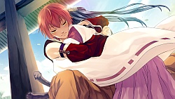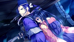 Genshin – Genshin is a teacher for small children in the village. He’s like the older nice guy type, but because he’s voiced by Inoue Kazuhiko that adds like 20 years to his age and frankly I felt like I was doing some ossan route :(. In this route, the plot ends up being that the bad guys kidnap some of the kids that Genshin teaches. During battle with the burly guy, everyone finds out that Genshin can read people’s thoughts. All the parents of the captured kids are now shocked and feel betrayed by him. They yell at him and call him a monster and tell him to stay away from the children. After the bad guy leaves, Genshin and Sayuki leave the raging villagers and that night he tells her a story of his past. When he was younger, in his village someone was stealing food. He used his powers to find out who it is, and told the guy to stop it and that he wouldn’t tell anyone…cause all he wanted to do was make the village peaceful again. Sadly the guy was a dickface and told everyone about Genshin’s powers and then lied saying Genshin used the powers to “control” people to steal the food. The villagers then ganged up on the poor guy and kicked him out of the village. (´・ω・`;) So from that day on Genshin tried to live with his eyes closed as much as he could so that he wouldn’t use his powers. He came to this village and decided to be a teacher, and despite Izumi & Seimei knowing about his powers, they still accepted him. Sayuki tells him that he’s not a monster and that he’s a very nice guy but then she also finds out that he cannot read her thoughts, possibly because of the way Seimei created her. So then at this point Izumi informs us that #1 & #2 are mia, Seimei’s also MIA along with Raikou and the sacred sword. Guess they’re all doing their uh..route businesses? 😆 The next day Sayuki tries to comfort a sad Genshin and he tells her that he’s no longer needed in this village as the children now have a substitute teacher.He goes on to further say that once the sacred sword mission is over, he will leave the capital.