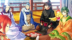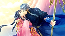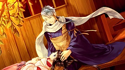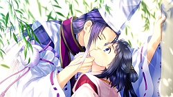 Miya Izumi – Sayuki does her work with Izumi in his route. Izumi is the prince of the capital and he has a body guard Raikou always by his side. He seems like a sweetheart until one day he tells Sayuki that falling in love is a waste of time because eventually one of the person’s feelings will fade and the love will end. When the princess tries to confess her feelings to Izumi, he tells her that it’s not love but just admiration. He says this because he knows that she’s to be a pure servant of god and cannot fall in love or marry. Despite this, later on he takes Sayuki on a date and walks through town with her holding hands (´^ω^`). The story basically is similar to Seimei’s route where the final battle begins with them fighting the demon lord. So then both Raikou & the sacred sword go MIA and everyone runs around looking for them. Izumi is so distraught without his manslave at his every whim that he doesn’t know what to do with himself and falls apart in front of Sayuki. Then a bunch of guys (or traps oh god Hino why..) come to kill Izumi because he’s apparently the inheritor of the sacred sword. So then some “shinigami” shows up and tries to kill Izumi and Izumi somehow shows up in a zombie like state and keeps babbling Sayuki’s name.Anyway needless to say Izumi gets sliced right accross the chest. Sayuki cries a river until Genshin’s like “lol okay enough trolling Izumi” 😆 and lo and behold Izumi comes out fine from behind the wall. He used a fake shikigami that Seimei created to fool the guys who came to kill him, which worked but sadly also fooled poor Sayuki XD. When Izumi looks at the cut on the fake body he freaks out saying only 1 person has that kind of sword technique.