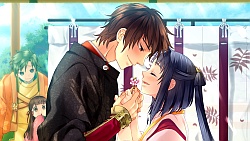 With the help of Suzaku, Sayuki tries to chase him down but he’s so out of it he bites her in the same fashion he bit his mother. Fortunately Sayuki can take it like a man and she’s like “it’s gonna be awwwright” and he turns back to human form. He babbles about how he’s a useless weak bum who just hurts the ones he loves, and Sayuki shuts him up with a kiss ||萌||ョ´∀`。)萌えぇ~↑ He then later kisses her again stating that hers didn’t count and how dare she kiss him before he kisses her! xDDD When they finish their ichaicha, Seimei’s ready to kick some Douman ass (and save the capital) and they make it out of that door. Seimei fights in his fox form that he can now control, & defeats Douman who then gets taken back to hell by the demon lord. So then Seimei does a special dance that clears all the fires and purifies the demon lord….who then turns out to be his father! LOL who woulda thought XD. The father asks Sayuki to take care of his son and he disappears. When they return they’re flooded with questions on what happened and not to soon after Seimei goes out on his next mission leaving Sayuki and the other 2 behind. Sayuki rages that her master is an ass and suddenly he’s like “who’s an ass? >_>” and she’s like “wait I thought you left” so then he tells her he forgot something….and gives her a kiss キタ(ノ゜∀゜)ノ━━━。;*:゜:+,.○*:゜.:+;*:゜:+,.○*:゜.:⌒━ He then goes off on his journey while Sayuki is in lala land awaiting his return as she cleans the house (´^ω^`). Daww at first Seimei kinda annoyed me being too S but he grew on me and actually really reminded me of Hijikata from Hakuoki lol. The whole hannyou thing gave me major Inuyasha flashbacks though….didn’t help that Seimei’s BGM sounds like “End of Memory” as well 😆 He definitely has the main character thing going on so sometimes I think I shouldn’t have done his route first lol.