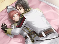 Robert comes into her room one night to give her a birthday party invitation for Baile twins birthday party and when Keith comes in he pretends to be hitting on Kanna making Keith really jealous. Then he’s like LOL JUST KIDDING and walks out leaving Keith alone with Kanna. Unfortunately both Raymond and Ronney die the morning of their birthday so needless to say the party’s over. Kanna then finds Keith crying at their graves because they were supposed to turn 21 that day and he couldn’t protect them. He quickly rebounds after this and tells Kanna their room will be cleared within a week and a new person will be living there soon. Kanna is shocked at how he can get over it so quickly and then she has some girl talk with Julianna who tells her to go see Keith. She goes into his room and then he shows up and tells her about the cross necklace he has. He then tells her he doesn’t want to use her as a weapon and he wants her to be by his side. When she asks if thats his feelings as a person or as an army commander he says army commander. Kanna then bitches at him saying she wants to know his true feelings and after he whines about how many people he’s killed, he hugs her asking if she can hear the beating of his heart~. Julianna later tells Kanna that Keith went off to school at the age of 15 and he never knew the warmth of a family. She asks Kanna to teach him what it’s like to live peacefully and be like a loving family to him. When he comes into her room one day, she’s in an apron making dinner for him and he’s like ( Д ) ゚ ゚ and suddenly gets all dere and hugs her saying this is what he always wanted! Suddenly Kanna’s like I love you! But before she can finish her sentence he’s like NO I SAY IT FIRST and then he confesses to her and they make out. Power of the apron! In the epilogue suddenly the war is over and Keith asks Kanna to live with him since they’re no longer commander & officer but lovers. Two months later they’re living together happily ever after. Meh Keith was rather anti-climatic to be honest and I didn’t really feel the same kind of romantic build up as other routes so it was weird when suddenly…I LOVE YOU! …just cause he saw Kanna in an apron lol. He also kept mumbling his words most of the time and was so unemotional…actually he was like a man Ayanami Rei now that I think about it. Blue hair red eyes lack of emotion….seriously the game makers aren’t doing anything to convince me they didn’t rip Eva off! 😆
