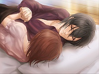 Two months later as Yuuki is recovering, he asks Kanna to tell him all about his past self from Sujiku as she wheels him around in a wheelchair. He then says he’ll make her happy to his best ability and they kiss. Poor poor Yuuki…why is it so hard to just give someone in this game a truly happy ending… (ಥ_ಥ)In the basterdize-your-favorite-character, er I mean “love” route, after Yuuki comes back from a battle Kanna blows on his wound like you would to a child because that’s what she used to do to him when they were kids. This causes some memories to pop up in Yuuki’s head and he gets a massive headache and admits that he often gets these headaches because he feels unknown memories coming back to him. He then says he doesn’t understand why Kanna keeps caring about him so much but when he tries to remember he gets a headache again. In this route Kanna’s obsession with the old Yuuki is pretty bad in this route to the point that Yuuki slaps dat ho when she complains that they’re sending him on a dangerous mission. He then apologizes and before his battle he hugs Kanna for good luck. When he returns from battle he’s badly injured and when Kanna goes to visit him, she finds him sleeping and out of his hand falls the pair ring that they bought the day of the attack on Sujiku. When Yuuki wakes up he says he saw a dream where he was younger than he is now and he lived peacefully and went to school with Kanna. Kanna lies and says that this is them in the future when the war is over and everything is peaceful again. He also says that he has no idea why he has this ring but feels like it’s something important to him.