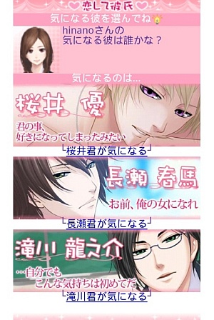 Well that hospital game was starting to get on my nerves with all its stupid glitches (I mean seriously if I had paid money for this I’d want a refund!) so I decided to try a different game called Koishite Kareshi. The game is pretty simple: you have 3 guys and you can pick one to be your “boyfriend” and from there on you can do various scenarios and events with him. The game is constantly being updated to reflect seasonal stuff so right now they have a Halloween event going on (although I’m probably going to miss it since I only started this game today ;_;.) I decided to pick Megane-kun cause he has a cool name Ryuugawa Ryuunosuke ww.