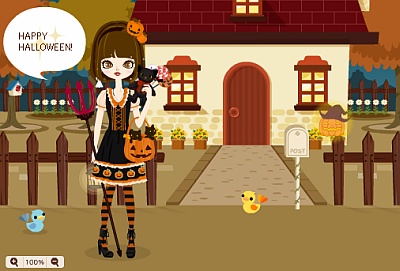 Your poupee is adorable though, she kind of looks like a candy wrapper and I just love those socks. The Halloween default BG is meh, but the one you have and the park don’t scream Halloween either.