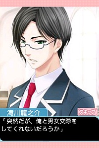 Well that hospital game was starting to get on my nerves with all its stupid glitches (I mean seriously if I had paid money for this I’d want a refund!) so I decided to try a different game called Koishite Kareshi. The game is pretty simple: you have 3 guys and you can pick one to be your “boyfriend” and from there on you can do various scenarios and events with him. The game is constantly being updated to reflect seasonal stuff so right now they have a Halloween event going on (although I’m probably going to miss it since I only started this game today ;_;.) I decided to pick Megane-kun cause he has a cool name Ryuugawa Ryuunosuke ww.