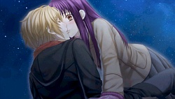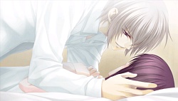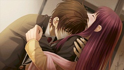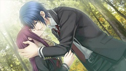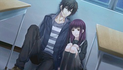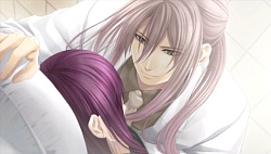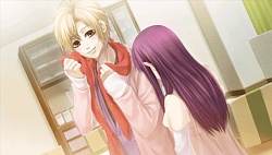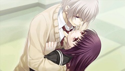 They tell him to her safety that he should stay away from her. After that he keeps avoiding her and when she tries to talk to him, he gives her more excuses as to not see her face to face. She even uses a key to get to his room and stands by his door asking if it’s something she’s done but he tells her it’s not her fault and says he just wants to be left alone. Reiji & Mitsuaki tell Kanna that Minaha’s just blaming himself for everything and that’s why he’s avoiding her. So then one day in school Mr. Cockblocker shows up to take Kanna again and she calls to Minaha for help. He shows up, and after the dude runs away, he tells Kanna that next time she should call Reiji or Mitsuaki because he has no confidence that he may not hurt her again. Finally Minaha lets Kanna into his room where he bawws about how weak he is and how he didn’t want to hurt her. That night while they’re attacked by Team Cockblock again, they run into a classroom and he licks the blood injury off her face to prove that he won’t go out of control. He proves it to the cockblockers and they back off and accept him..and then he proposes to Kanna to be his waifu. (♡´౪`♡) And so they become a raburabu couple and when they go to the winter dance party, they skip it and instead go to be alone on the roof together. So then she slips on the snow and topples both of them over. Minaha then grabs the opportunity and kisses her while she panics and freaks out. Anyway the route pretty much ends there which felt rather sudden and incomplete to me…and there was no epilogue either. (´・ω・`;) Slightly disappointed I guess but I’m really glad Kaji Yuuki didn’t do his grating shota voice. I wish he would do this kind of voice style more often instead.