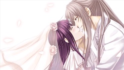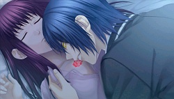 Kitou Kaki – Well Kaki is the douchebag groom for Kanna and well throughout all the other routes he was pretty much missing in action. In fact I completely forgot about his existance until I realized I need to do his route to finish the game :lol:. After the wedding ceremony she tells him she’s not going to have his babies, and threatening to kill her, Kaki starts strangling her on his bed. ( ´_ゝ`) Fortunately the 3 wings come to her rescue and plant their seals on her so that they can save her from Kaki’s PMS outbursts. Since this is Kaki’s route though, whenever Hibiki attacks her, she actually calls out his name for once instead of some other guy. When Kaki gets poisoned by Hibiki at his house and Kanna takes care of him, he asks why she doesn’t hate him since he kinda messed up her life for 16 years. Kanna’s so jaded she’s not sure what to answer except that she can’t stop staring at all the scars on Kaki’s body and asking him if he’s in pain himself. I guess she’s like “well I was treated like shit, but looks like he’s done a lot of hard livin’ so we’re even” ? 😆 When she returns to school that night Kaki she goes to check on Kaki in his bedroom and he ends up pulling her in and using her as a dakimakura all night long. She tries to escape but he has a death grip on her, so finally in the morning she manages to squiggle free xD. The next day after school she runs into the forest where she finds Kaki & Mitsugi and after like I don’t even know what was going on but first Mitsugi’s about to fight Kaki, then he’s like no wait I’m not hurting any bride and then before you know it, Kaki’s locking lips with Kanna. Lol wut. Hold me, thrill me, kiss me kill me? 😆
