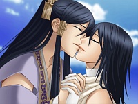 So then Mizera starts getting BL jealousy of Sou and Toko and betrays them…by getting his body taken over by Hardef again! So then out of jealousy Mizera starts blaming Toko for “destroying the barrier” but fortunately Sou believes in her…until he finds out that she’s the reincarnation of the godess Faltina! If she uses her magic powers then she will die and that’s where Sou starts getting all sad panda because he doesn’t want her to go byebye. Toko tells Sou to stop being a pansy and defeat Hardef cause they can do it, YES WE CAN! And so Sou goes to fight Mizera, who for a moment gets his self back and asks Sou to attack him without holding back. Fortunately Aki shows up as reinforcement to help finish off Hardef. Toko uses her powers but fortunately she doesn’t die and she wakes up to a crying Sou with sparkles in the background. The villagers then apologize for being assholes and thank Toko for saving them and Aki tells Mizera that he’ll leave his punishment for “later”. In the epilogue Sou gets manly and grabs Toko and makes out with her. Erm well I liked Sou’s Love Steals the most if anything but he was a bit too…plain I guess? XD Also being forced to gaman love steals near the end kinda killed the fun of the route for me…and then seeing him looking like a Final Fantasy reject the rest of the route was the ultimate K.O. Actually Koori informed me that Mizera is actually a girl pretending to be a guy cause she was in love with Sou. Uh I must have missed that detail somewhere along the way 😆