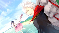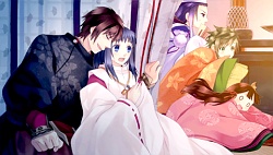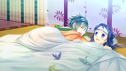 Abe no Seimei – During the shell gathering, Sangou gets stuck in the rain until Seimei comes to her with an umbrella being tsuntsun as usual. XD As they walk home he gets wet and Sangou tells him to take his kimono off but he’s like (/ρ\)いやーん and tells her he’ll do it himself. She even accidentally walks in on him changing until he tells her to GTFO. (Guuurl shoulda stayed xDDD.) She does end up helping him dry his hair though and then he grabs her and rolls into the futon using her as his heater. (*´ω`*) He ends up falling asleep that way and they spend the night together. Sangou even takes initiative and kisses him while he’s sleeping 萌━゚☆;。+(*pq′ー`)+。;☆゚━萌 . The next morning Seimei’s arm falls asleep from Sangou sleeping on it all night and so the two of them have trouble getting up – until Ichigou & Nigou hear them haha 8D. Seimei makes up some dumb excuse to get them to leave so that they don’t see him & Sangou cuddling in bed together XD. In the 2nd scenario there’s more rain again and this time Sangou catches a cold again. This time Seimei takes care of her while she’s lying in bed. We also see a flashback when some rich guy from the capital recruits Seimei to come there to help people out with his onmyoji powers. A few days later that guy ends up dying along with Seimei’s current shikigami disappearing due to its time limit and energy loss. Turns out that guy was Raikou’s father and the following day Izumi & Raikou ask Seimei to work for the capital. After Izumi’s party thing ends, Seimei and Sangou watch the cherry blossoms & snow falling as Seimei says he wants her to be with him as a lover not as a contracted Shinigami. In Seimei’s after story, he goes off on one of his long trips again leaving Sangou alone with Nigou.