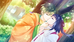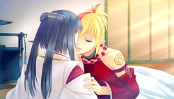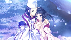In the after story, Sangou’s doing her waifu training so she can be the proper one for Izumi. In addition, Yoriko starts calling her “Shiroyukizakura-sama” and acting like fancy & proper to her but Sangou isn’t too happy because she doesn’t feel natural in this new position. It gets even worse when she can barely even see Izumi because he’s too busy doing his emperor duties and so she spends most of her time with Yoriko. Eventually Izumi can’t stand being away from Sangou for that long either so he ends up sneaking out to see her. They cuddle in a carriage as they go to a place far away so they can enjoy some time alone to themselves – all while Rei poses as Izumi to entertain all the rich folk. They get to the river bank where with Raikou’s help they run away where no one can see them. Izumi tells Sangou that he has rich dudes constantly coming to him asking him to marry their daughters but he don’t want dem hoes, he only wants his bby Sangou. They go into the woods and place hide & seek together and before Izumi can find her she starts panicking thinking he had to suddenly leave or something and ditch her xDD. When he’s about to kiss her they hear Raikou looking for them so they hide behind a tree and make out before he can find them. ( ≖‿≖) I almost flipped a table thinking we’d never get a real kiss CG but fortunately at the end we did. Izumi’s after story was cute but I felt like that Awayuki part was really….odd. The flashbacks practically had nothing to do with Sangou and before I knew it it had ended and I was like wut that’s that?