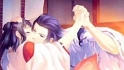 Miya Izumi – I left Izumi for last since it seemed like he was the main lead of the fandisk with his whole awayuki no utage nonsense and the stuff with his brother Rei. Yoriko helps Sangou dress up in a special kimono just for Izumi. After she’s dressed up, Izumi starts putting some lipstick on her mouth with his finger and then says he’s disappointed that now he can’t kiss her. Instead he kisses her hair and and says he knows that she’d never want to be a “kept waifu” who sits in the palace all day doing nothing. The next day while doing errands for Seimei, Sangou ends up falling into the lake and Izumi finds her and takes her back to the place telling her to spend the night. Needless to say she gets sick AGAIN ヽ(。_゜)ノ and so Izumi ends up taking care of her. The next morning Sangou wakes up with Izumi asleep on top of her in a pile of half finished paper cranes xD. He wakes up and jumps into the futon with her and rolls around together. (ノ´∀`*)ノ Later, there’s a flashback to Izumi and Raikou sitting on top of the palace roof like they did when they were kids. They also show Seimei joining the shigoryou with Ichigou & Nigou. Erm yea that was it and so then after the revelation with Rei, Sangou meets Izumi under the moonlight like in all other routes. They both say they love each other and then Izumi kisses her but it looks like he’s kissing her cheek and HIS WHOLE HEAD BLOCKS BOTH OF THEIR FACES. GDI I WANNA SEE KISSING MAN (ノ ゚Д゚)ノ ======= ┻━━┻.