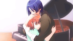 Shinomiya Natsuki – I don’t know if I picked a bad route to start with or what but this was a disaster. So Haruka buys Natsuki this teddy bear that he can hug when he moves in with Ai & Sho once more. The two of them don’t see each other much because they have to hide their relationship from Ai. So when one day Natsuki starts making out with Haruka on his bed Ai is like AHEM GAIZ I’M STILL HERE. He starts bitching at Natsuki saying that he’s an idol and he should be better at hiding his relationship with Haruka. So then shit hits the fan when during one of the practices, Ai’s arm falls off and everyone’s like ( Д ) ゚ ゚. Turns out AI is a robot (for Artificial Intelligence). He’s a singing robot aka a vocaloid created by Saotome and since Haruka accidentally finds out his secret, the professor asks Haruka to help take care of him. He gives Haruka an instruction manual on what to do in case Ai overheats or something. And so because Haruka ends up keeping this “Secret” from Natsuki, he starts having major trust issues WHICH LEADS HIM TO A MENTAL BREAK DOWN. Haruka watches it like some kind of fucking retard and instead of reassuring him she stands there like a log and Natsuki eventually chucks Haruka’s bear and runs out. Haruka goes to run after him but then Ai stops her GOD DAMNIT AI FUCK OFF (ノ ゚Д゚)ノ ======= ┻━━┻. After giving Haruka is dumb speech about Natsuki’s insecurities WHICH I KNOW BTW I PLAYED REPEAT KTHX finally Haruka runs to the ocean where she finds Natsuki playing the viola. AND INSTEAD OF FUCKING COMFORTING HIM SHE GOES “I WANT TO DEBUT WITH YOU TOO” AND SHE TURNS AROUND AND RUNS HOME TO COMPOSE MUSIC. ヽ(。_゜)ノ