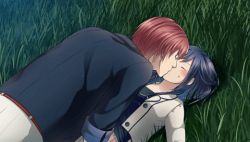 After they leave the aquarium Tsubaki notices Ui lost one of her earrings so he goes to look for it but similarly to Musashi’s route, some guys hit on her. Tsubaki comes back and gets pissed and slices them up. He then asks if Ui’s scared of him because of his violent nature but she’s like NOPE. After he takes her home he kisses her and then confesses that he loves her (*´▽`*). But then Ui has to babble how he’s just lonely and he’s like “yea well so are you if you accept a guy like me lol.” She babbles but eventually agrees to go out with him so he gives her a 2nd kiss as “lovers”. None of Ui’s friends approve of her dating Tsubaki. At the school trip he says he’s jelly of her relationship with Kyosuke but she tells him it’s no big deal and he’s just like a childhood friend to her. Tae bitches hard core that he’s brainwashed Ui into dating him orz. At night they go into Tsubaki’s room but Musashi’s like “lets get drunk instead of fighting PARTAAAYYY” and everyone drinks random stuff. Nagare sensei walks by telling them it’s too late to be partying but when he comes in everyone runs into the futons to hide. Since there’s not enough Ui jumps in with Tsubaki and he can’t stop groping her all over :lol:. Once Nagare leaves, she punches him away calling him an eronezumi in her head xDDD. So eventually he brings her to where he “lives” which is like a random grassy area under the bridge. He then says that this place is inconvenient now that he’s dating her because there’s no place for him to screw her. He then pushes her on the ground and says “Don’t worry if someone comes I’ll just kill them” xDDD. He at least sets a barrier around them so that nobody walking by can see them, human or youkai ww. And so they sex it up outside \( ^o^)/. A few days later he takes her to a place up in the mountains where there are tsubaki flower trees blooming. He then gets all rico suave on her putting a flower in her hair and calling her beautiful to which of course Ui resists as always :roll:. When he finds out she was thinking about what she did to Shinji, he gets pissed and then kisses her followed by a hickey on her chest. He invites her over his under the bridge ghetto grass field to screw but she’s like uh no thanks & goes home.