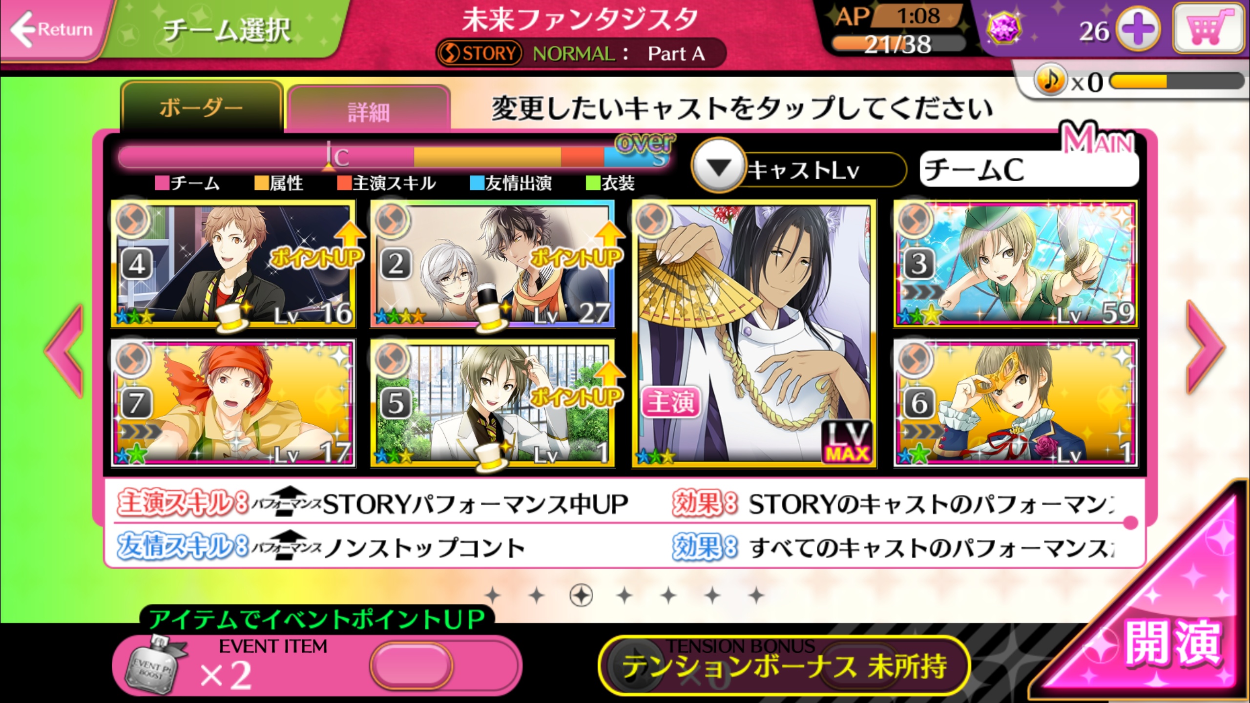 Speaking of cast, the reason its called cast is in fact because the setting of the whole thing is “broadway musical”. So as you play the music game, you pick a “cast” of boys to help you increase your score. There’s 3 types of “affiliations” with each song: Music, Dance and Story. Each song has its own affiliation so you want to match up the right card with the song’s “status” to get that bar at the top filled up as much as you can. This means that even if you are awful at the music game, you can still get S rank thanks to your cards.