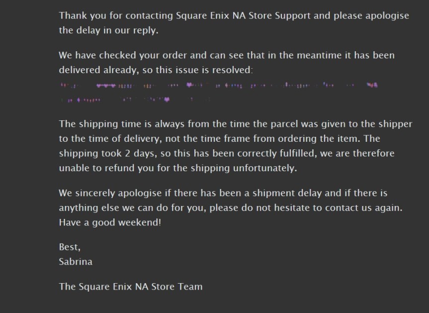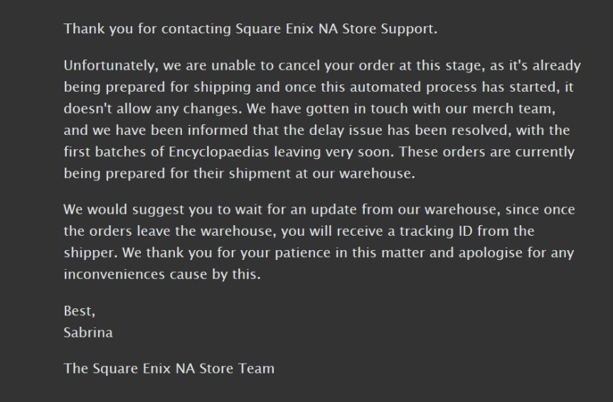 On September 17, 2018 I placed my preorder for the book which was to be released on November 24. Come November 24th, all my friends in Japan are getting their books but there’s no movement on mine in fact it was still listed as “Pre-order” on the store. I also noticed a “Debit Now” button so I thought “oh no is it because I didn’t press this button my order wasn’t shipped?!” I panicked, and pressed the button and had them charge me 60 bucks. Days go by, with dead silence. Other people are getting shipping emails, but I’m not. What’s going on? I decided to contact their customer service – which by the way is an EMAIL FORM HIDDEN DEEP INSIDE THEIR FAQ. They have no phone number and if you try to contact the general Square Enix account help line, they will tell you they have “no information on anything at the store.” Cool, the left hand has no idea what the right hand is doing. After contacting them via email I got a response:
