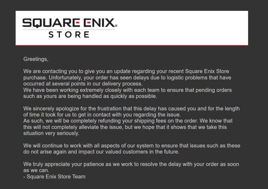 Hahaha…..guess who just went through something similar? 😂My mom (bless her she tries despite being so concerned that I’m not out of the “anime phase”) bought me a figure of Noctis from their store for Christmas and immediately she gets blocked out of her account. Apparently you can’t just add an item to your cart and then checkout. You’re supposed to login during the checkout (not before because that makes sense). We had to go through their FAQ to contact them as well and it took them 3 weeks to respond…but by then we had already figured out how to purchase something without getting booted out or told “sorry, your account doesn’t exist” or the lovely, “you’re already a member please enter your member email and password” when we already had done so. After placing the order, they tried to say her card had expired. So she updates her card, nothing works, we call the bank and they verify that everything’s fine. We shoot them another email and in 2 days of waiting for some response, the card magically is accepted. Then they send us an email saying the exact same thing your first one did…logistics issues.