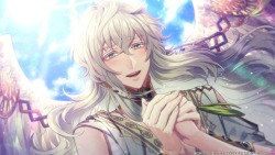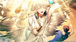 Il Fado de Rie – Il is otome game man and basically felt like a mirror image of myself when playing this whole game 😂😂😂. Loves going to otome game events and collaboration cafes and stays up late trying to finish a route. The best part is seeing all the otome game references from other Otomate games in a lot of his backgrounds. Unfortunately Il has a very poor understanding of how to act around humans and is often treated like the babby of the group. He accidentally puts a bunch of people to sleep at the park and everyone is shocked but he doesn’t understand why it’s bad. After doing much googling he has no luck figuring out why all the other guys are ok but he isn’t when it comes to interaction with humans. He then keeps trying to be useful by cleaning up after himself because he realizes he hasn’t done anything to help Kotone. Unfortunately it just ends up with him breaking dishes which is why nobody lets him do anything in the first place. He’s really bummed about this so to cheer him up Kotone decides to play the remake of his favorite and first otome game. So then a series of incidents begin happening around town where a bunch of angels begin kidnapping humans. When one of the victims is Kotone’s high school friend, Il interferes to try and save her. He beats them up but has his arm blown off and bleeds like crazy. Kotone freaks out and starts crying but Il acts like it’s no big deal and then mumbles some program language to fuse and repair his damaged arm like the Terminator 😂😱.