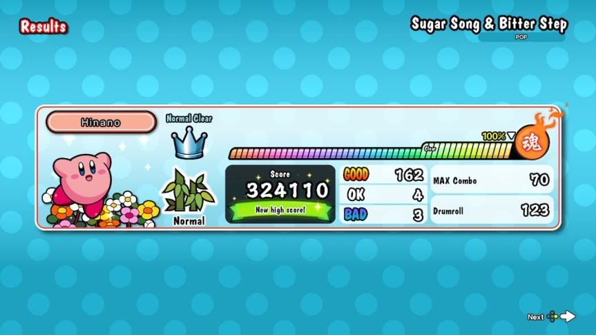 Now the one absolutely amazing feature of this game is the ability to just straight up pick different characters to play as. It’s not just for looks either – each character gives you buffs or nerfs. So for example Kirby helps you get more goods but the one I found myself consistently using were the 2 drum sticks: they basically make all your dons and ka’s the same. That means you can press the same button regardless of color. It’s amazing how much this makes the game challenge trivial. In exchange though, they have made all the songs insanely hard that in the past I was able to clear most hards/some oni now I struggle even with normal mode songs. 😫