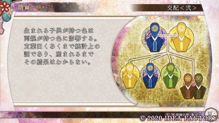Alright incoming massive spoilers because there’s a lot to unpack here. The game takes on some weird godly fantastical pan Asian island and intertwines the Japanese mythology gods Izanami, Izanagi, Tsukuyomi, Amaterasu, Susanoo and Hiruko. The problem is Otomate made a bunch of shit up to fit their plot so a lot of it is NOT TRUE. A good article I found on the mythology you can check out here. Anyway here’s the deal, the entire island has a color caste system where the 3 main colors are Red, Yellow and Blue (though because we’re getting into some fancy shit here they refer to as Scarlet, Indigo and Gold). For the purpose of my review (and because I think the entire thing is idiotic – and you will see later why) I am gonna just refer to them as Red, Yellow and Blue. So because of this system there’s a lot of stupid laws where you cannot breed with someone of a further color and mixed colors are considered trash and if you are born without a color or a poo color like brown or swamp green, you’re banished into the “underworld” which they call Yomi. Yomi in this game though is just a town hidden underneath the mountain in the island which the residents of it can never leave once exiled there, but people from above can visit them if they get a special pass. This doesn’t make the main primary colors immune though because if say a red color falls in love with some swamp green and they bang, they will be arrested and potentially given the death penalty – depending on the rank of your color. One of the characters, Kaina was arrested and thrown in Yomi but his lower color girlfriend was executed.