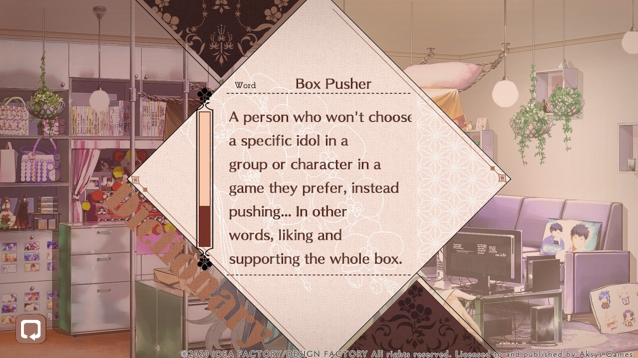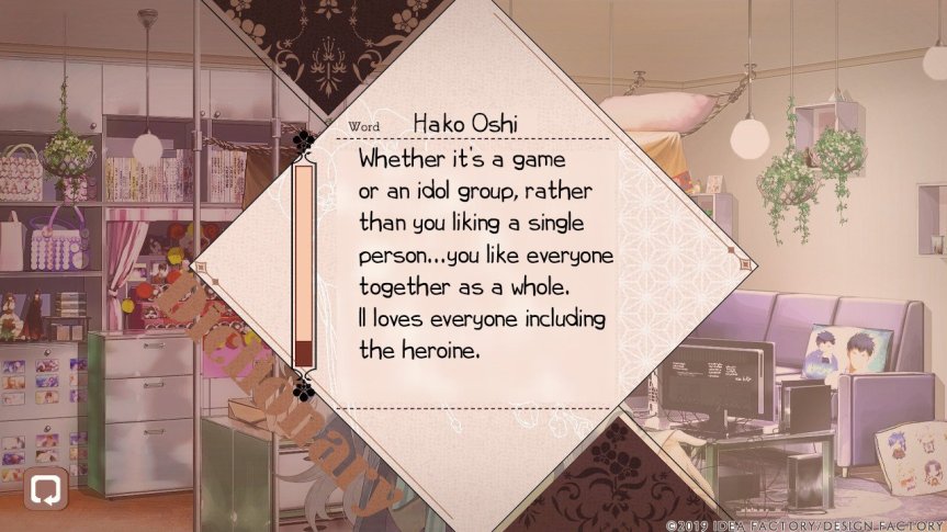 Not only is that straight up wrong, it means that the person just literally threw the thing into google translate which literally translates it as “box pusher” because the word 押し in otome game terms means to “have a favorite” and the hako is a slang term for “group”. For reference here was my original translation of it when I played in Japanese: