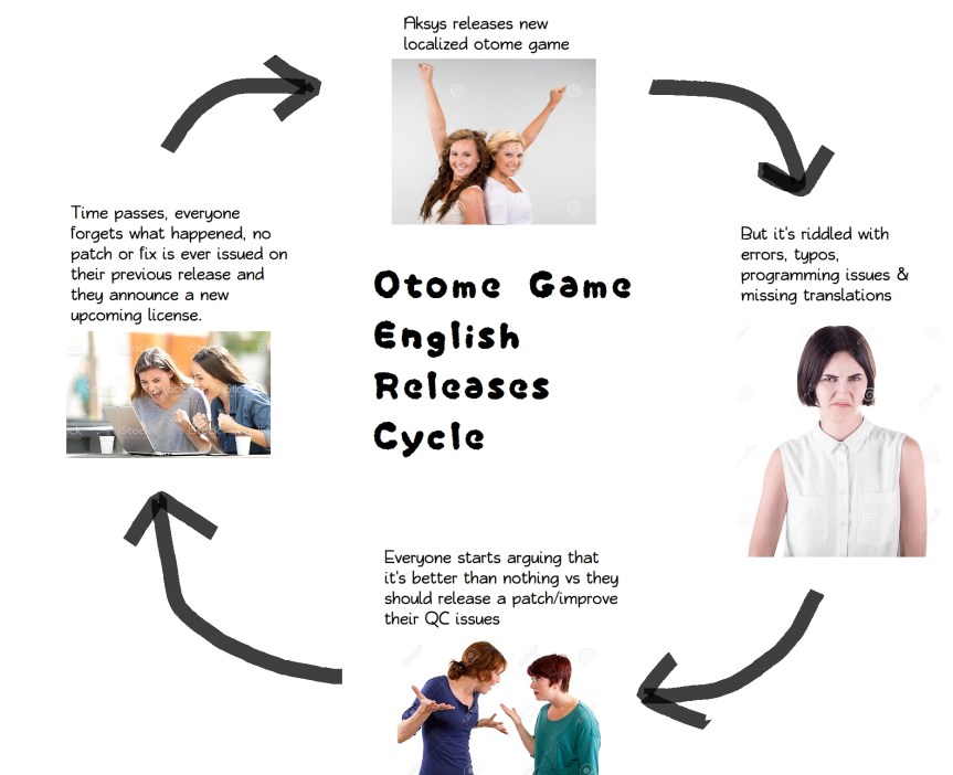 But there are people who this doesn’t bother at all. It’s like people who were happy importing shitty Hong Kong bootleg DVDs back before we had decent translated and localized anime options. They were also under fire for talking about how they prefer to localize dark edgy games instead of cute games with sparkles – because god forbid OTOME games not appeal to a male audience right? ಠ_ಠ Guess we’ll never see Cupid Parasite in English, way too much girly sparkles and butterflies in that one (although I am shocked they licensed Variable Barricade and Olympia Soire??) Anyway obviously the only solution to this problem is for another company to come and take over or well be like me, dedicate your life to your hobby and learn Japanese. 😂