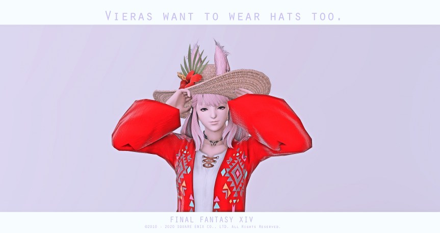 Speaking of hats, we are now almost 2 years into the expansion and Vieras have not gotten a single hate or hair update. Unbelievable. Lots of new hair and hats have been released but Viera? Hrothgar? Lel. I love my viera and all but I’m getting really frustrated at paying the same sub as others but not getting equal treatment of my favorite race :'(. The only solution now is to resort to hat mods that you can’t even post publicly without an angry mob on you or to just change to any other race. While I love my bunny, I’m starting to get tired to be honest and I’m actually considering going back to my midlander hyur for 6.0 if Vieras get absolutely no update again. My alt is already a midlander so what I might do is just swap races between alt and main so I can always take bun pics if I feel like it. I’ve waited almost 2 years Square Enix….please 🥺😭