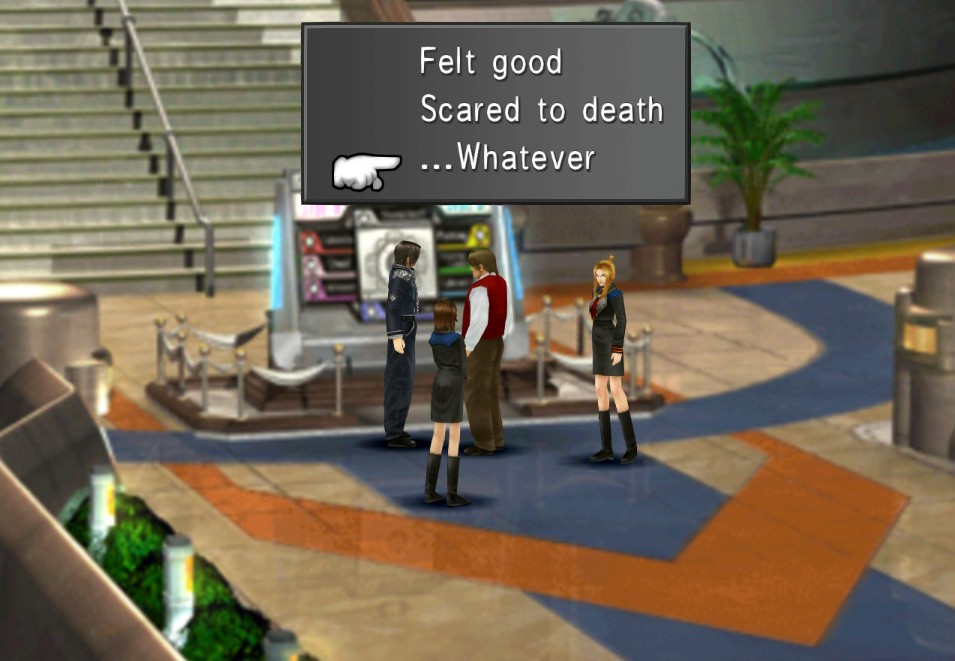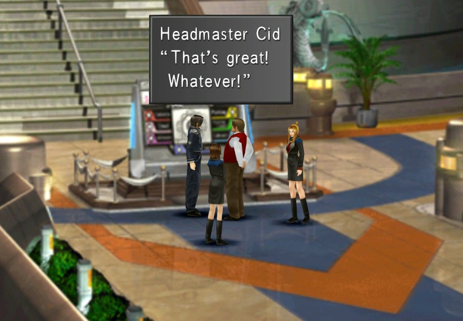 Now as for the story, I vaguely remembered hearing something something Squall is dead and also a time loop something something, but honestly other than the ending movie (which was like 15 minutes long and didn’t really make much sense until the final seconds of “oh right, guess he made it back through the time compression after all”) it seemed fairly straightforward. This was nothing like the FFXIII games, where three games later and I still don’t have the faintest idea what happened or what a fal’cie or a l’cie is AND YOU CAN’T MAKE ME LEARN. What REALLY was baffling about the story line though was the truly bizarre dialogue and actions that the characters often did. Like there’s typical comic relief scenes from characters like Zell and Selphie, but I’m talking about stuff like “You like beverages, don’t you?” or Rinoa casually pushing Irvine down a flight of stairs or “I dreamt I was a moron.” I don’t even want to say this was ‘bad” or whatever because it was funny but like…funny because it felt like it had no place whatsoever in the game?