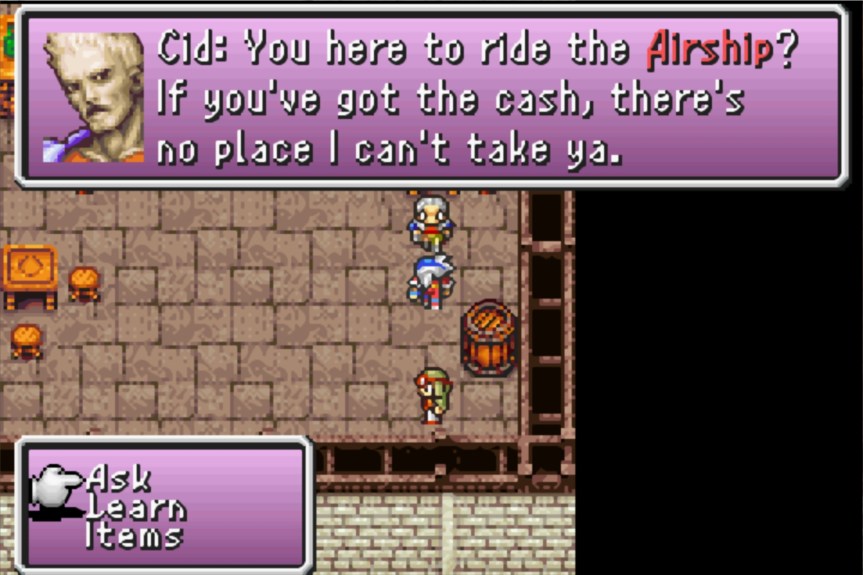Like with a lot of FF games there is Cid and his airship but you only get it to fly freely at the VERY VERY end of the game, like 2 chapters away from beating the game and by then do you honestly care to go back to do sidequests? And on the topic of quests, all the quest dialogue was insanely unclear. The game had this strange “Learn” and “Ask” system. So what you had to do is whenever an NPC said a highlighted word you first had to select “Learn” to learn this keyword. Once you “learned” it , you then had to talk to them AGAIN to “Ask” info about said keyword. More often than not it was unclear WHICH NPC had a keyword you needed to learn and which one you had to then “ask” so I found myself sometimes running back and forth between towns because person in town A had a “learn” keyword while the dragon in castle B had the “ask” and when you asked you would get the key item you needed to proceed with the quest that would then take you to dungeon C. Annoying. Nowdays in FF games you basically just talk to one npc who explains what you have to do and where you have to go and it’s easily marked on your map.