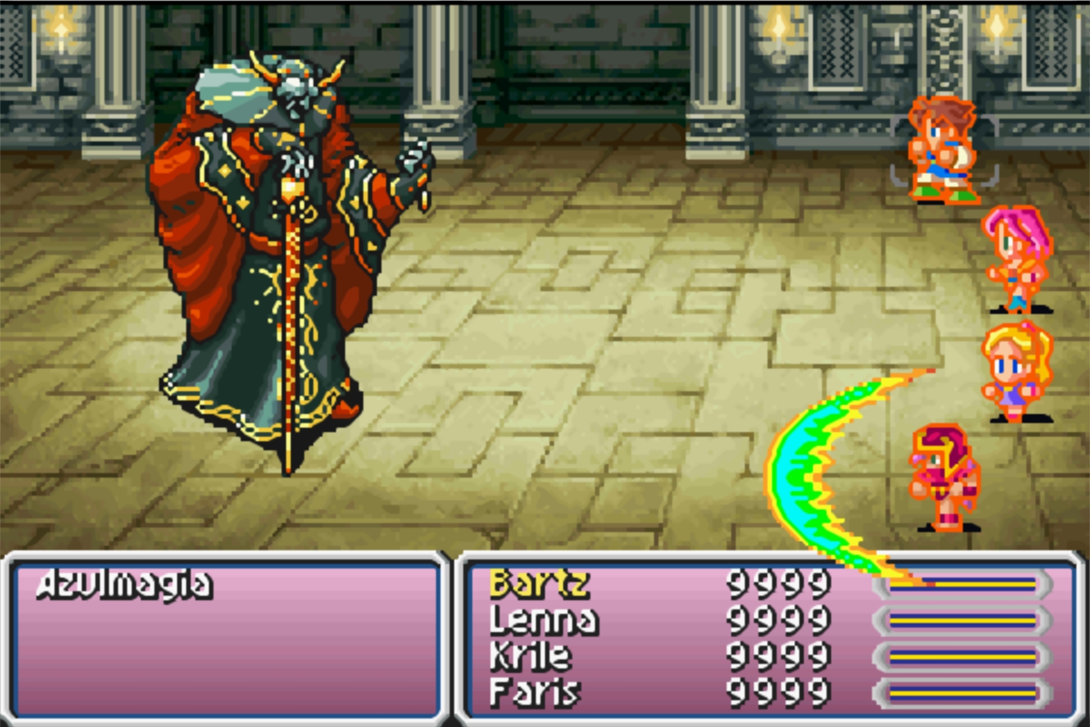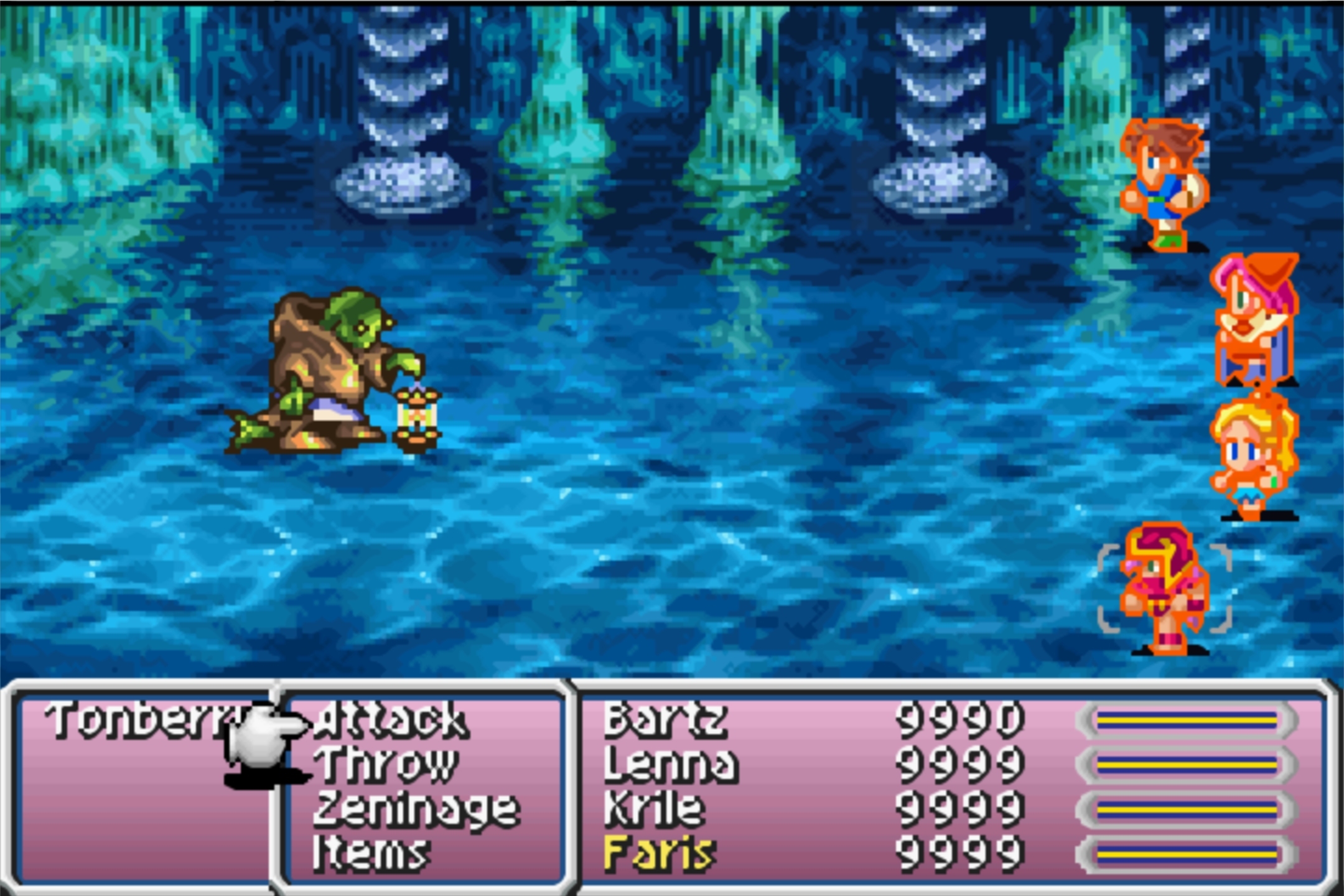 Okay seriously though, the first and most important thing I gotta get out of the way: this game had BY FAR the biggest mismatch between Amano’s concept art (which was used for the character portraits) and the sprite art. It was kind of jarring in FFVI with stuff like “Is Terra’s hair supposed to be blonde or green or greenish blonde?” but in this one it’s like “Is Faris supposed to look like she stepped out of Rose of Versailles or out of Record of Lodoss War?” Even the various Final Fantasy mobile games can’t decide which versions to use and alternate between them.
