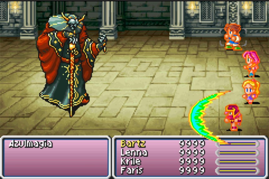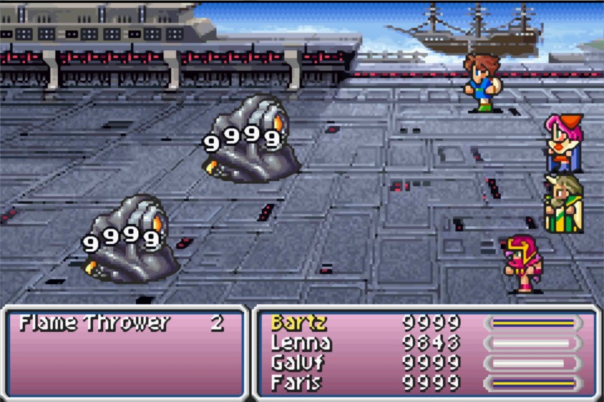 The game style as usual is pixelated but I played the GBA version which featured some character portraits but unfortunately as usual they were by Amano and looked nothing like their in game sprites (which the CGI movie also used.) Unlike FF6 this game had a lot less characters, which gave you a lot of character development (except you Lenna sorry) and really had you get to know them and laugh with them and go on your 32 bit adventure.