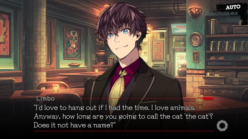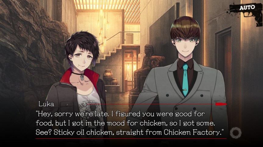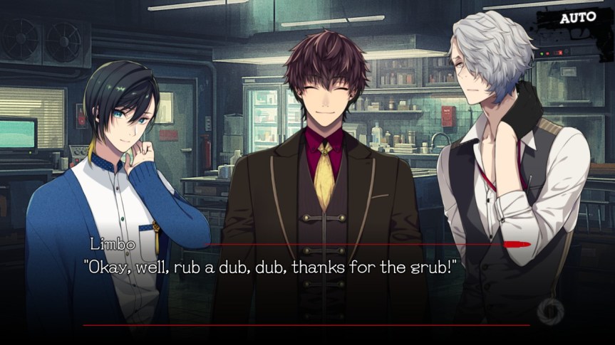 This in turn means Bustafellows is definitely the least otome-y otome game out of the ones I’ve had to review so far (and not just because Teuta is an actual character with real dialog and voiced lines). The “A” routes for all of the guys are these hard-boiled crime thrillers (but not THAT Hard Boiled), and while there’s usually some “shipping” or “sexual tension” (aka what normies call it) nearly all of the romance is reserved for the short “B” routes that are unlocked after their good endings. What this also means is that there’s no Amnesia-style dialogue choices wowowowowowow! Yes, that’s right, no dialogue choices where if you pick “eat chocolate ice cream with senpai” instead of “try to solve the mystery” you get hit by a car and die (you also get hit by a car and die if you unwisely choose “eat vanilla ice cream with senpai”).