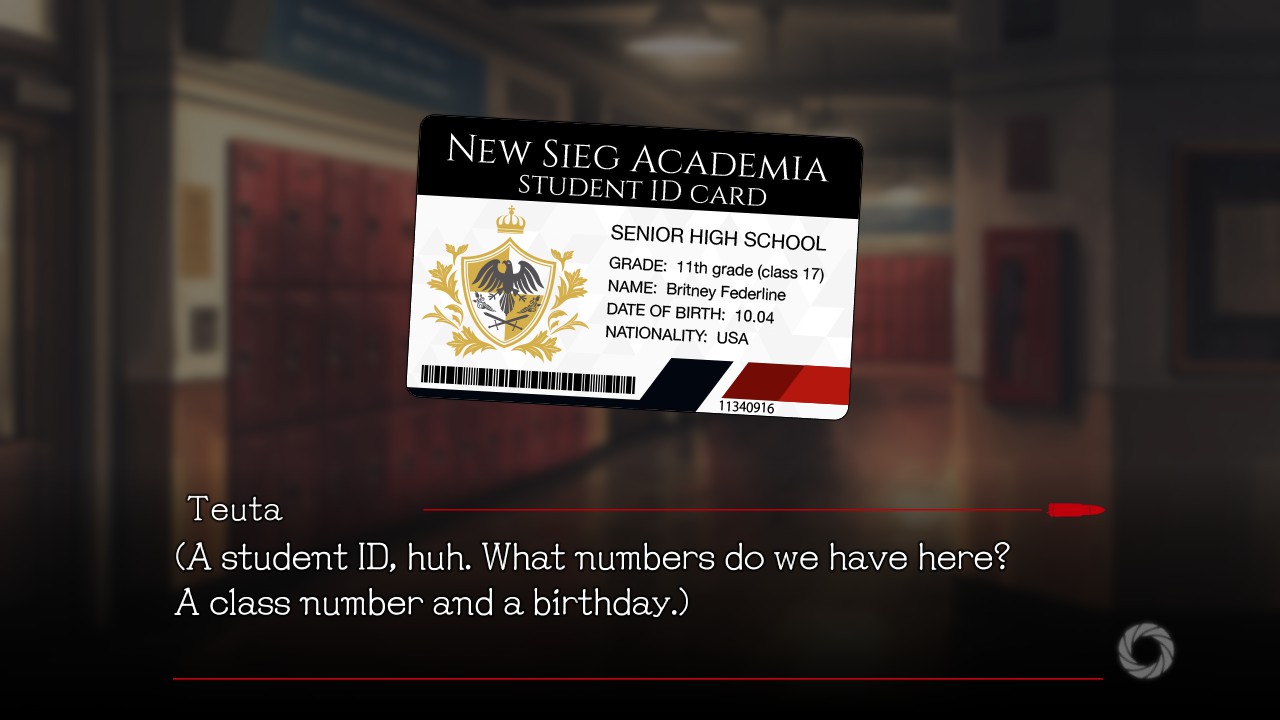 That’s right, actual sensible choices! The game also gets a little creative with these at times. (One of the guides I found on Steam was inadvertently quite confusing in the choices for each route, because it tried to explain exactly what was going on with them, like “you need to win the bet here so that you’ll have enough money to pick up the tab in chapter 3”). The most prominent one is where you take a personality test early in the common route which is the primary driver for which character’s route you will move on to. My personal favorite one though was during Helvetica’s route where during the obligatory Teuta time travel scene, where you need to guess the PIN for the cell phone of the person that she bodyjacked based on the stuff that you find in her locker so that you can call him up to warn him (also, loooooooooooooooool “Britney Federline“).