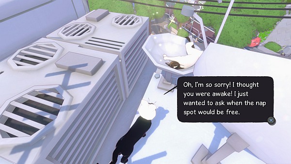 At one point the menus started completely showing off screen, particularly during the conversation I had with the baby ducks in the building balcony pool. I had no idea what they were saying because the speech bubbles somehow moved off screen with no way to spin the camera or move them back. Some achievements were also annoying and too RNG based like getting people to take your photo. Most people just ignored me, some would just trip and some would pet me but then move on. The pick up cans and recycle them also got tedious when I ran around but couldn’t find any stray cans laying around to pick up. I also gave up on the rubber duckie achievement even though I got 3/4 because I had no idea where the 4th one even vanished to. And finally the most confusing thing was the map – it looked like you could explore the north and south east parts of it but I could not for the life of me find a way to go there myself. Everything felt blocked off so I’m not really sure why they bothered drawing that area of the map in the first place. Maybe it’s an upcoming DLC?