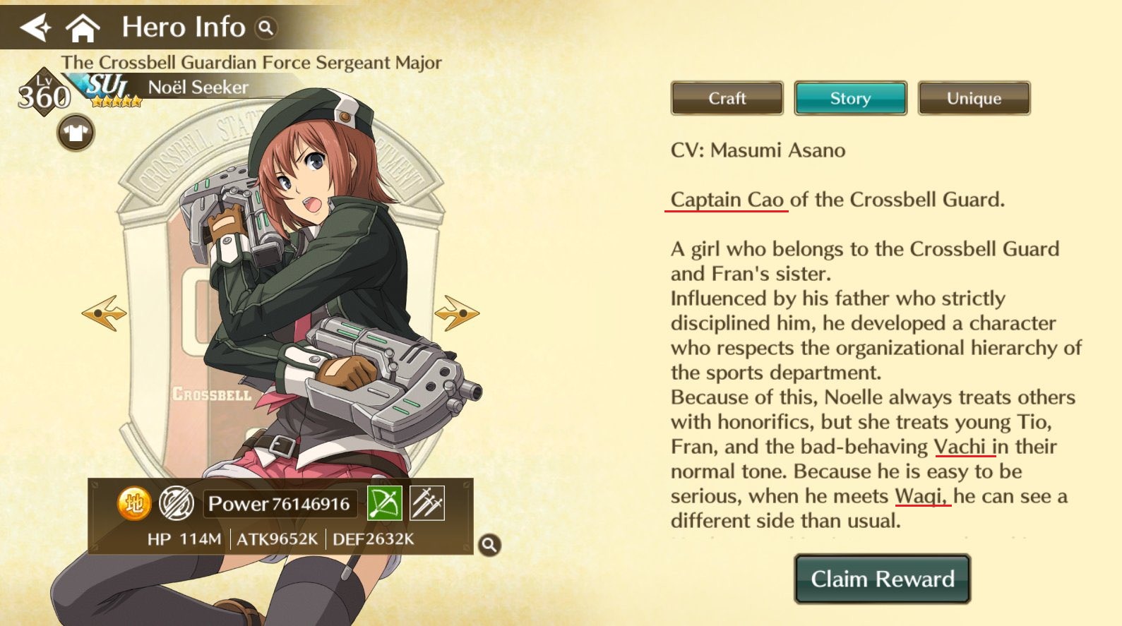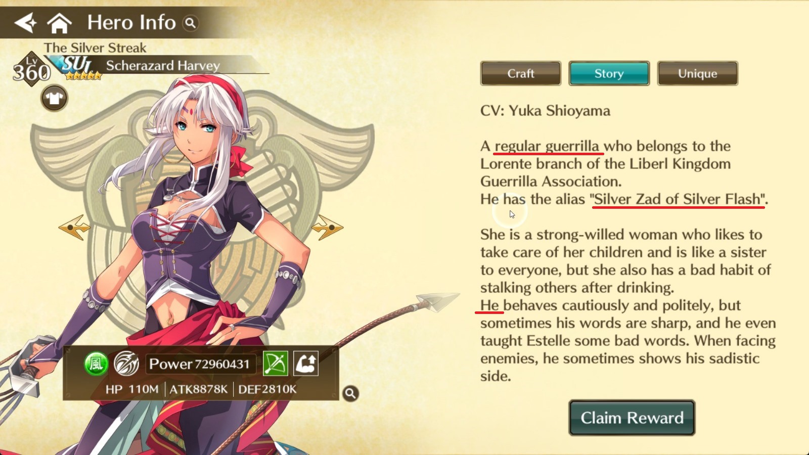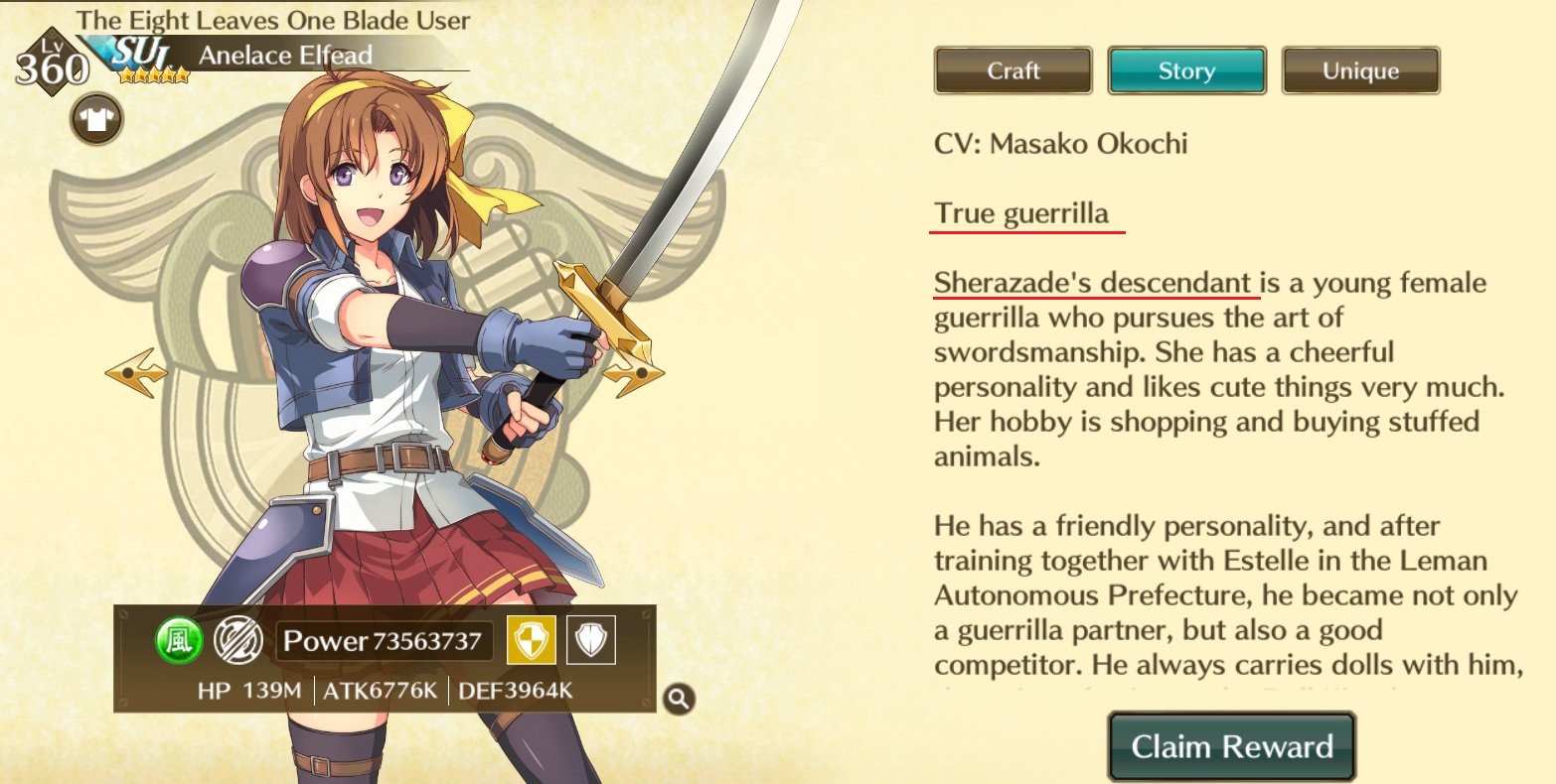 And finally the biggest pitfall of this game: the localization. And holy shit is it BAD. It looks like it was run through some shitty AI translator because you have characters whose gender is listed as both HE and SHE in the same paragraph. You have characters whose titles are completely mismatched (i.e. Laura being listed as a musician instead of Elliot.) You have character background stories that are completely straight up WRONG like saying that Rean was in Trails in the Sky. 😂😂😂 (For anyone who has yet to play the Trails games: he wasn’t.) Then they butchered names like writing Duvalie as “Du Barry” or Kloe as “Crosay”. On top of this there’s various typos and just badly translated sentences that make no sense in English. It’s clear they were shoving this game out the door quickly with no care about Trails. All Trails serves is a reskin of some shitty battler busy work afk mobile game and nothing more. Hell some characters, even SSR ones, don’t have voices in the game. I won Ennea’s SSR and during the battles when doing her S-break she was basically silent while others had some kind of one liners. Check out the gallery below of some screenshots of the terrible localization blunders: