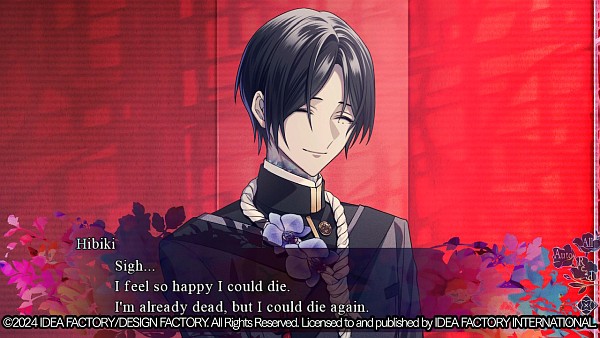 Hibiki – Hibiki is the hangman who lives in his own little mirror world while sporting a cool flower adorned noose around his neck because he well…died by hanging himself. He was also another victim of Isao’s but he refused to let Isao torture and kill him, so he decided to end his life on his own terms. When he meets Misa he instantly falls in love with her and starts going in heat whenever he’s around her because he has like no control over his emotions. Due to this he’s at high risk of becoming a wraith and Misa has to be his therapist (like most Otomate heroines) to get him to calm his tits. This is why Seiya, the hellmaster, stuffed him into a mirror so that he’d have his own space to relax and not get overstimulated but that all changed when Misa decided to poke the mirror one day. Like with Kureha, they fall in love because Misa cannot resist mentally deranged yandere boy, and the 2 of them go to hell together to speak to Isao directly.